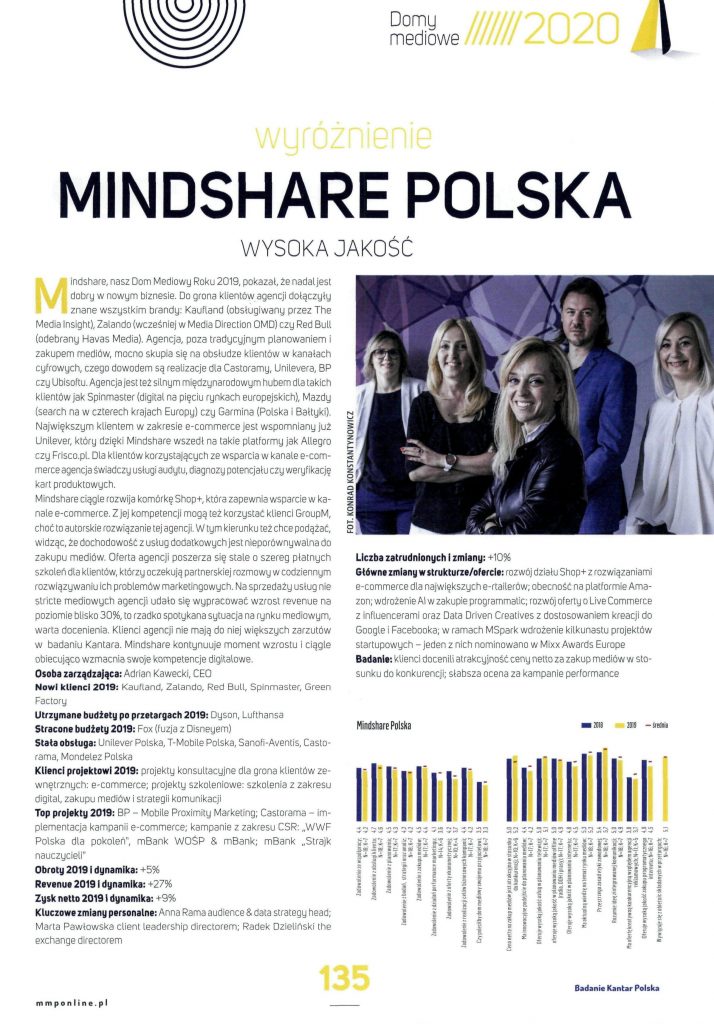 Klienci Mindshare bardzo dobrze ocenili współpracę z agencją. Z kolei zdaniem redakcji pokazała ona, że potrafi skutecznie pozyskiwać nowych Klientów. Do jej portfolio dołączyły takie brandy, jak: Kaufland, Zalando, czy Red Bull. Agencja została również doceniona za rozwój i wzmocnienie kompetencji e-commerce oraz digital, skupienie się - poza tradycyjnym planowaniem i zakupem mediów - na obsłudze Klientów w kanałach cyfrowych, a także spektakularny wzrost revenue o blisko 30%.